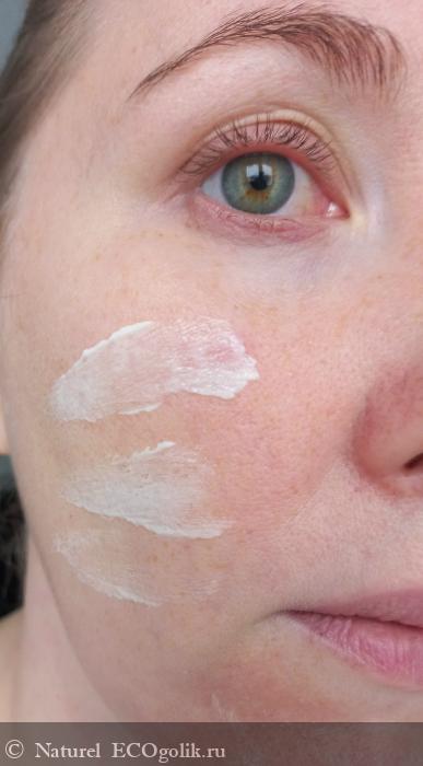 Крем хорошо держит форму, по при этом легко распределяется по поверхности кожи, не растягивает ее и довольно быстро впитывается, оставляя небольшой масляный финиш.