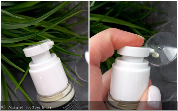 Подача средства осуществляется с помощью помпового дозатора, который исправно выдает крем контролируемыми порциями.
