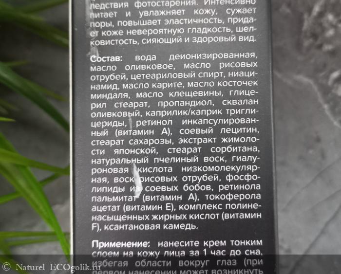 вода деионизированная, масло оливковое, масло рисовых отрубей, цетеариловый спирт, ниацинамид, масло карите, масло косточек миндаля, масло клещевины, глицерил стеарат, пропандиол, сквалан оливковый, каприлик/каприк триглицериды, ретинол инкапсулированный (витамин А), соевый лецитин, стеарат сахарозы, экстракт жимолости японской, стеарат сорбитана, натуральный пчелиный воск, гиалуроновая кислота низкомолекулярная, воск рисовых отрубей, фосфолипиды из соевых бобов, ретинола пальмитат (витамин А), токоферола ацетат (витамин Е), комплекс полиненасыщенных жирных кислот (витамин F), ксантановая камедь.