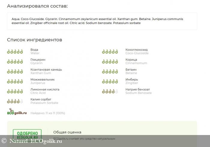 Aqua (вода), Coco-Glucoside (мягкий ПАВ), Glycerin (глицерин), Cinnamomum zeylanicum essential oil (эфирное масло корицы), Xanthan gum (ксантановая камедь), Betaine (бетаин), Juniperus communis essential oil (эфирное масло можжевельника), Zingiber officinale root oil (эфирное масло имбиря), Citric acid (лимонная кислота), Sodium benzoate (бензоат натрия), Potassium sorbate (сорбат калия).