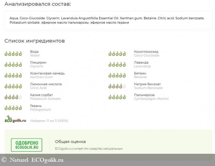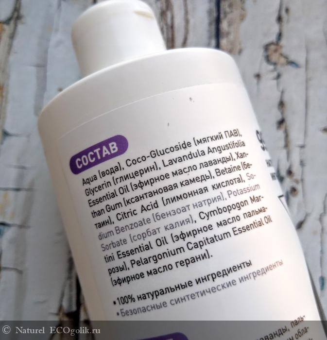 Aqua (вода), Coco-Glucoside (мягкий ПАВ), Glycerin (глицерин), Lavandula Angustifolia Essential Oil (эфирное масло лаванды), Xanthan gum (ксантановая камедь), Betaine (бетаин), Citric acid (лимонная кислота), Sodium benzoate (бензоат натрия), Potassium sorbate (сорбат калия), Cymbopogon martini essential oil (эфирное масло пальморозы), Pelargonium capitatum essential oil (эфирное масло герани).