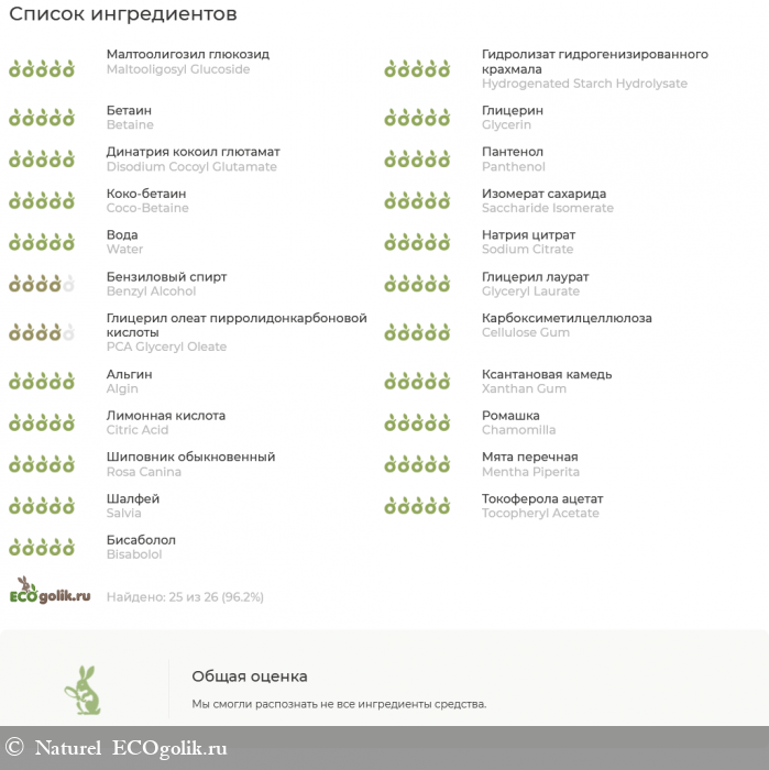 Aqua, Maltooligosyl Glucoside (and) Hydrogenated Starch Hydrolysate, Natural Betaine, Glycerin, Disodium Cocoyl Glutamate*, Panthenol, Coco Betaine*, Saccharide Isomerate (and) Aqua (and) Citric Acid (and) Sodium Citrate*, Benzyl Alcohol (and) Glyceryl Laurate*, PCA Glyceryl Oleate*, Cellulose Gum (and) Algin*, Xantan Gum, Citric Acid, Chamomilla Recutita (ромашки) Extract, Rosa Canina (шиповника) Extract, Mentha Piperita (мяты) Extract, Salvia Officinalis (шалфея) Extract, Tocopheryl Acetate (ВитаминЕ), Bisabolol, Gardenia Jasminoides Oil (эфирноемаслогардении).