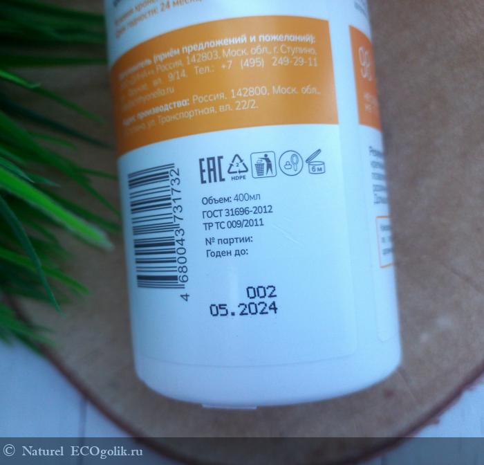 Упаковкой для продукта служит флакон из белого пластика, который оформлен в едином стиле с Манговой серией бренда.