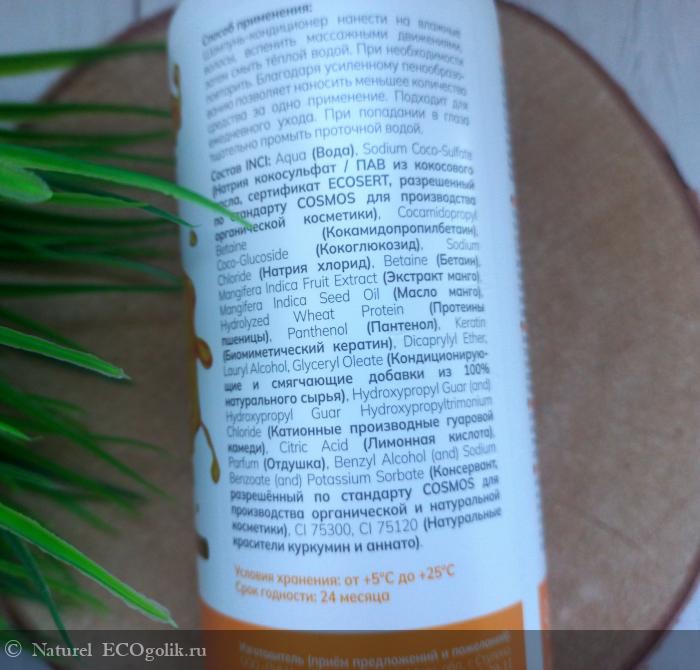 Вода, натрия кокосульфат, кокамидопропилбетаин, кокоглюкозид, натрия хлорид, бетаин, экстракт манго, масло манго, протеины пшеницы, пантенол, биомиметический кератин, дикаприлиловый эфир, лауриловый спирт, глицерил олеат, гидроксипропилгуар, гидроксипропилгуар гидроксипропилтримония хлорид, лимонная кислота, отдушка, бензиловый спирт, натрия бензоат, калия сорбат, краситель куркумин, краситель аннато.