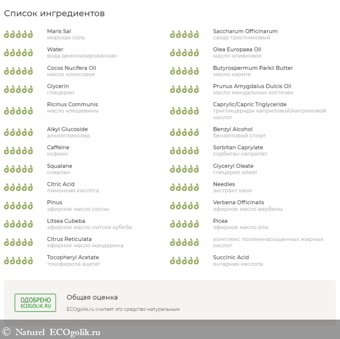 морская соль, сахар тростниковый, вода деионизированная, масло оливковое, масло кокосовое, масло карите, глицерин, масло миндальных косточек, масло клещевины, триглицериды каприловой/каприновой кислот, алкилглюкозиды натрия, бензиловый спирт, кофеин, сорбитан каприлат, сквалан, глицерил олеат, лимонная кислота, экстракт хвои, эфирное масло сосны, эфирное масло вербены, эфирное масло литцеи кубеба, эфирное масло ели, эфирное масло мандарина, комплекс полиненасыщенных жирных кислот (витамин F), токоферола ацетат (витамин Е), янтарная кислота.