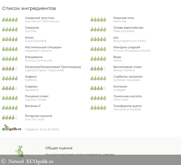 сахар тростниковый, морская соль, сахароза, масло оливковое, масло кокосовое, масло карите, глицерин растительного происхождения, масло миндальных косточек, масло клещевины, вода деионизированная, триглицериды каприловой/каприновой кислот, алкилглюкозиды натрия, порошок мякоти абрикоса, бензиловый спирт, кофеин, сорбитан каприлат, сквалан, гидролизованный коллаген, глицерил олеат, лимонная кислота, пигмент CI 77007, ароматизатор KL№0005 (идентичный натуральному), комплекс полиненасыщенных жирных кислот (витамин F), токоферола ацетат (витамин Е), янтарная кислота.