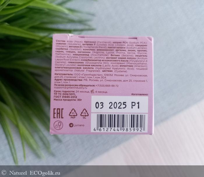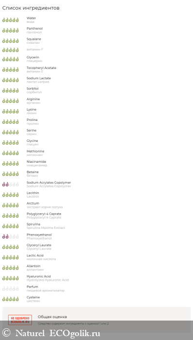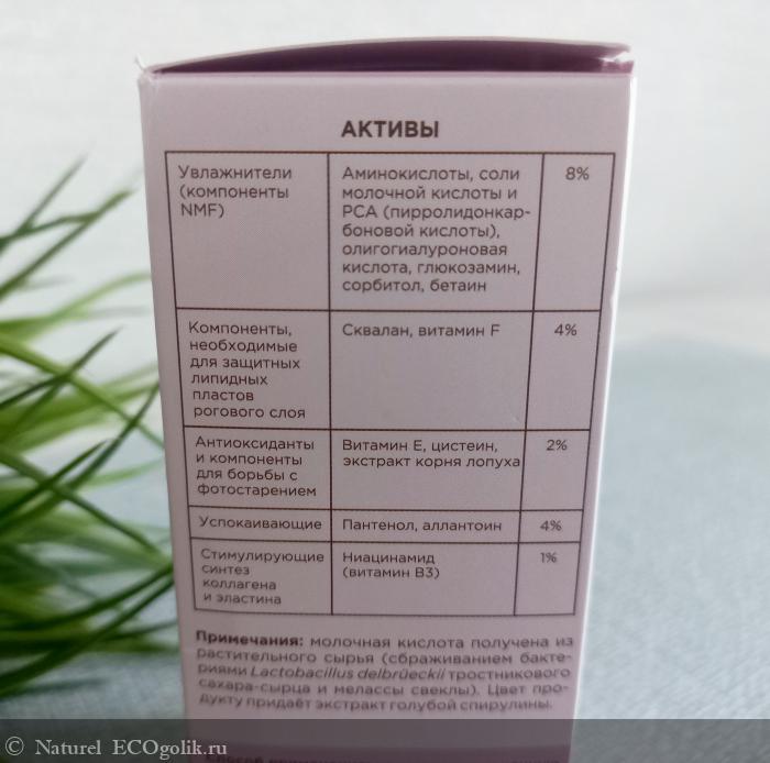 вода (Aqua); пантенол (Panthenol); натрия PCA (Sodium PCA) сквалан (Squalane); витамин F (Linoleic Acid, Linolenic Acid); глицерин (Glycerin); витамин E (Tocopherois Blend); лактат натрия (Sodium Lactate); сорбитол (Sorbitol); комплекс аминокислот: аргинин, лизин, пролин, серин, глицин, метионин (Arginine, Lysine, Proline, Serine, Glycine, Methionine); ниацинамид (Niacinamide); бетаин (Betaine); лецигель (Sodium Acrylates Copolymer, Lecithin); экстракт корня лопуха (Arctium Lappa Root Extract); солюбилизатор из кокосового масла (Polyglyceryl-4 Caprate); глюкозамин (Glucosamine HCI); экстракт голубой спирулины (Spirulina Maxima Extract); консервант Sensicare C1000 (Phenoxyethanol, Glyceryl Laurate); молочная кислота (Lactic Acid); аллантоин (Allantoin); олигогиалуроновая кислота (Hydrolyzed Hyaluronic Acid); пищевой ароматизатор (Natural Fragrance); цистеин (Cysteine).
