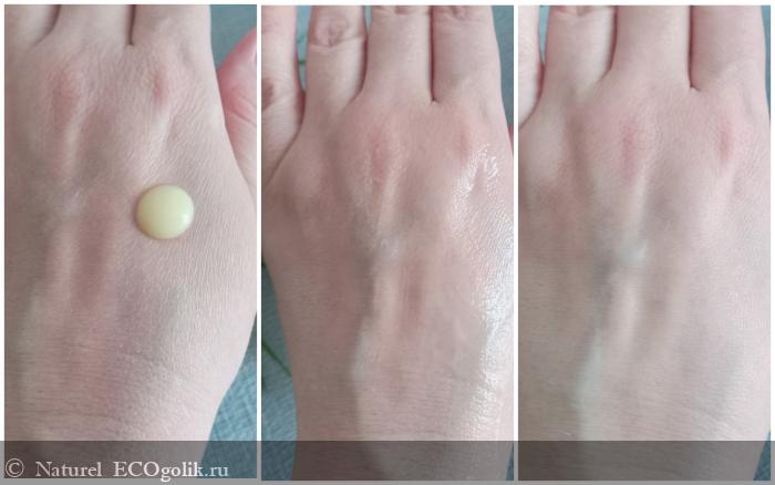 Продукт отлично распределяется по коже скользящими движениями и очень быстро впитывается, не оставляя после себя жирности или липкости.