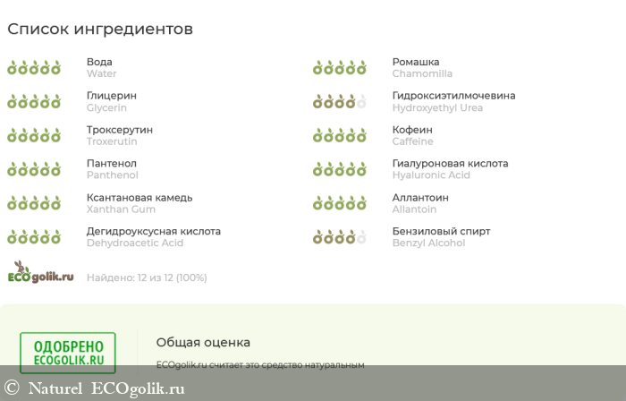 Water, ChamomillaRecutitaFlowerExtract, Glycerin, HydroxyethylUrea, Troxerutin, Caffeine, Panthenol, HyaluronicAcid, XanthanGum, Allantoin, DehydroaceticAcid, BenzylAlcohol