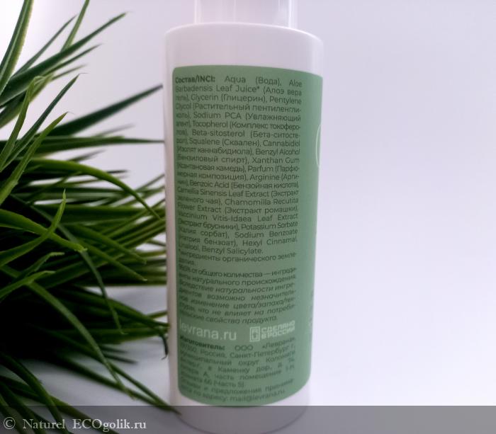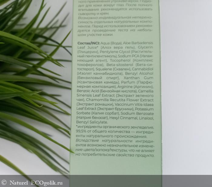 Aqua (Вода), AloeBarbadensisLeafJuice* (Алоэ вера гель), Glycerin (Глицерин), PentyleneGlycol (Растительный пентиленгликоль), Sodium PCA (Увлажняющий агент), Tocopherol (Комплекс токоферолов), Beta-sitosterol (Бета-ситостерол), Squalene (Сквален), Cannabidiol (Изолятканнабидиола), BenzylAlcohol (Бензиловый спирт), XanthanGum (Ксантановая камедь), Parfum (Парфюмерная композиция), Arginine (Аргинин), BenzoicAcid (Бензойная кислота), CamelliaSinensisLeafExtract (Экстракт зеленого чая), ChamomillaRecutitaFlowerExtract (Экстракт ромашки), VacciniumVitis-IdaeaLeafExtract (Экстракт брусники), PotassiumSorbate (Калия сорбат), SodiumBenzoate (Натрия бензоат), HexylCinnamal, Linalool, BenzylSalicylate.