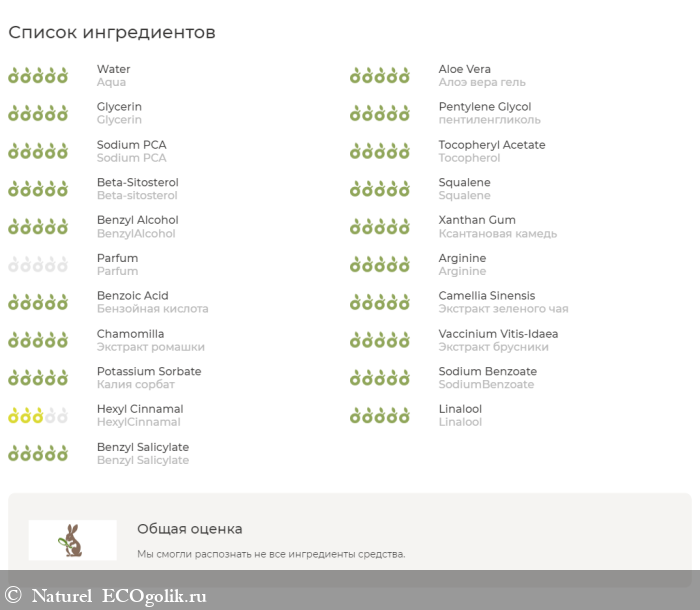 Состав в целом сервис проверки Ecogolik одобрил, оценив такой компонент как гексилциннамал на троечку. По сути данный компонент – это ароматизатор с цветочным запахом, он входит в состав эфирного масла ромашки, но также может быть синтетического происхождения.