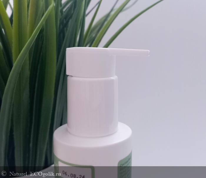 Флакон изготовлен из белого плотного пластика, который венчает помповый дозатор, дополнительно защищенный заглушкой от случайного вскрытия во время транспортировки.