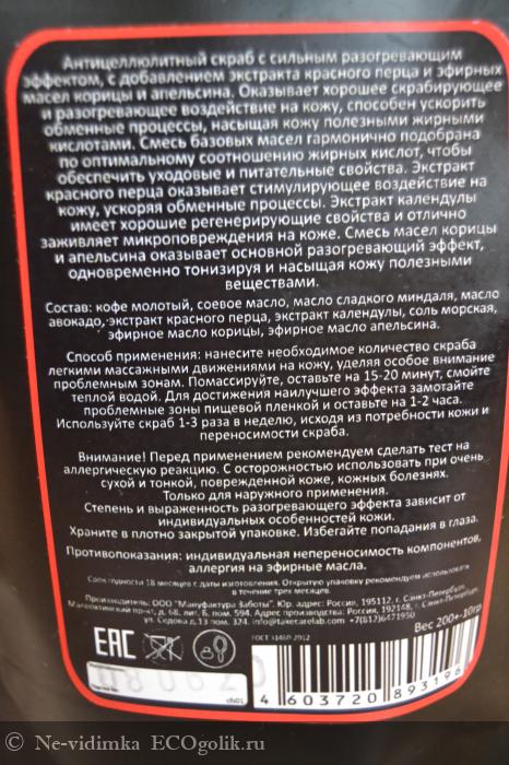 Состав: кофе молотый, соевое масло, масло сладкого миндаля, масло авокадо, экстракт красного перца, экстракт календулы, соль морская, эфирное масло корицы, эфирное масло апельсина.