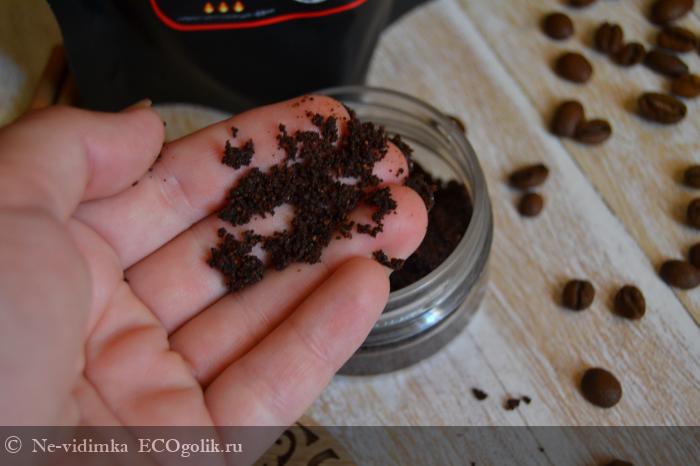 Скраб представляет собой рассыпчатую промасленную смесь кофе и соли (которую практически не видно). Скраб более сухой и рассыпчатый, по сравнению со своим собратом - Сладким кофе.