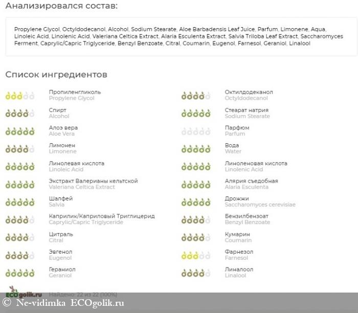 Состав: Propylene Glycol, Octyldodecanol, Alcohol, Sodium Stearate, Aloe Barbadensis Leaf Juice*, Parfum***, Limonene****, Aqua, Linoleic Acid, Linolenic Acid, Valeriana Celtica Extract**, Alaria Esculenta Extract, Salvia Triloba Leaf Extract*, Saccharomyces Ferment, Caprylic/Capric Triglyceride, Benzyl Benzoate****, Citral****, Coumarin****, Eugenol****, Farnesol****, Geraniol****, Linalool****