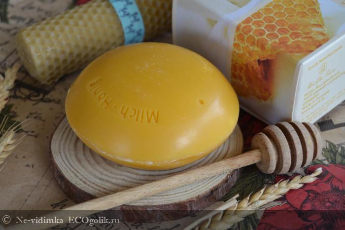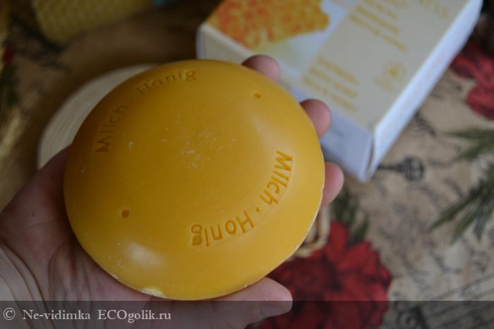 На одной стороне мыла есть надписи "Milch", "Honey", а на другой - оттиск производителя.