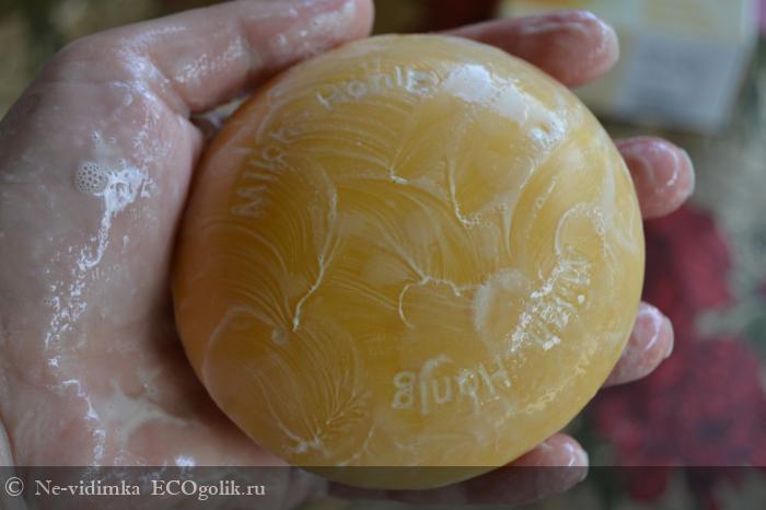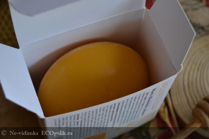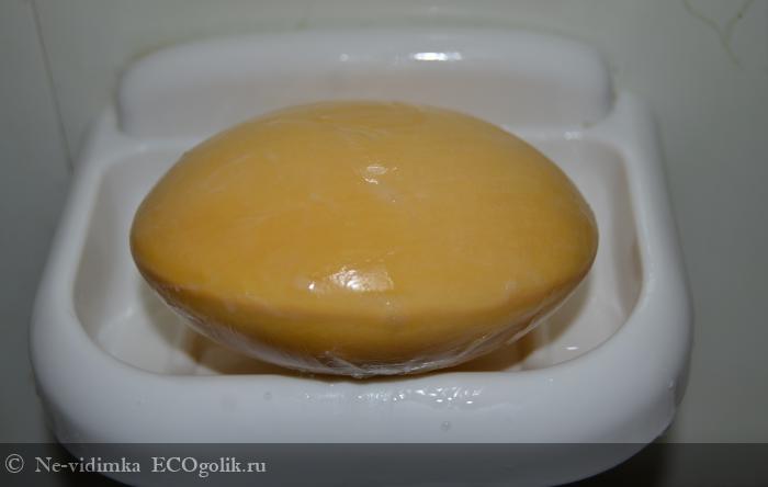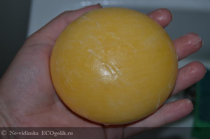 Мыло круглой формы, выпуклое в середине и скошенное по краям. Оно очень твердое и плотное. Цвет - насыщенный желтый, словно держишь огромное солнце в руках