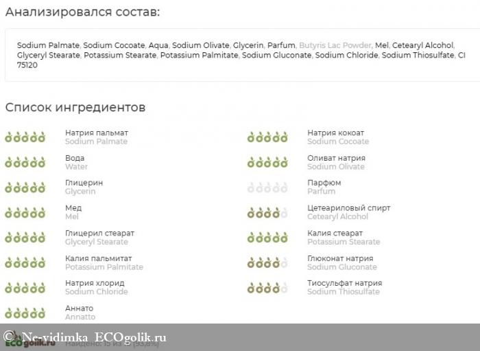 Состав: Sodium Palmate, Sodium Cocoate, Aqua, Sodium Olivate, Glycerin, Parfum, Butyris Lac Powder, Mel, Cetearyl Alcohol, Glyceryl Stearate, Potassium Stearate, Potassium Palmitate, Sodium Gluconate, Sodium Chloride, Sodium Thiosulfate, CI 75120.