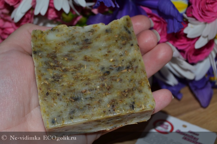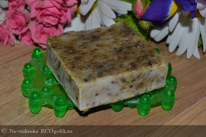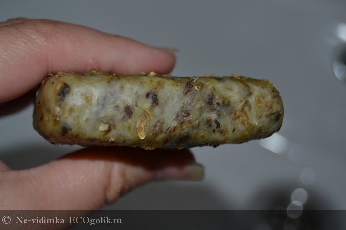 Само мыло трудно определимого цвета, коричневато-зеленый оттенок ему придают измельченные травы.