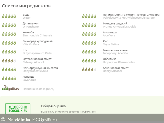 Состав: Вода, полиглицерил-3-метил-глюкозы дистеарат (растительный эмульгатор ECOCERT), Д-пантенол, масло миндаля, масло жожоба, гель алоэ вера, масло виноградной косточки, масло рисовых отрубей, масло ши, витамин Е, цетилстеариловый спирт, экстракт облепихи, дегидроуксусная кислота, бензиловый спирт (растительные консерванты), эфирное масло лаванды.