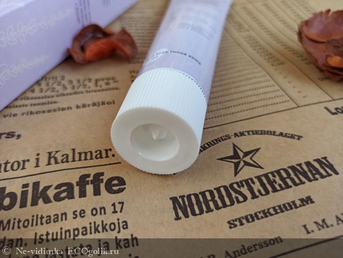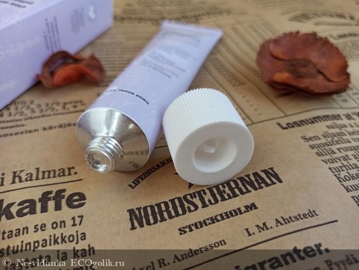 Первоначально же упаковкой крема является алюминиевая туба. Не скажу, что это мой любимый вид упаковки, так как периодически мнется, заламывается, быстро теряет привлекательный вид. Но тюбик у Ecomake выполнен качественно - израсходовала уже почти половину, а он в очень хорошем состоянии.