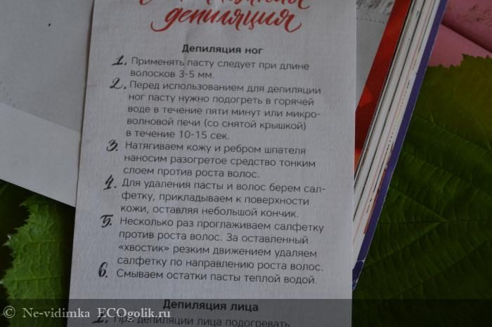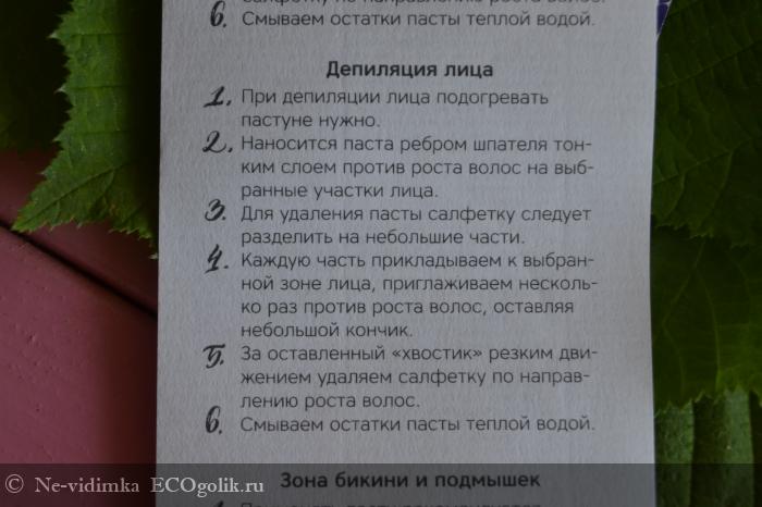 ПРИМЕНЕНИЕ: нанести пасту ребром шпателя на нужную зону против роста волос, приложить салфетку, пригладить несколько раз, а затем удалить ее по направлению роста волос резким движением руки параллельно коже. Остатки пасты при необходимости смыть водой.