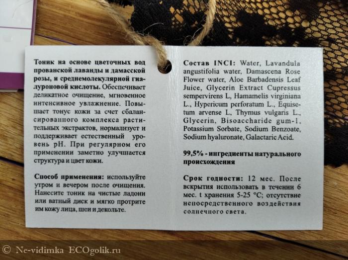 Состав: Вода, гидролат прованской лаванды, гидролат дамасской розы, сок алоэ вера, глицериновый экстракт Кипарис Вечнозеленый, Гамамелис Виргинский, Зверобой Продырявленный, Хвощ Полевой, Тимьян Обыкновенный, глицерин, биосахаридная камедь, калия сорбат, натрия бензоат, гиалуроновая кислота среднемолекулярная, галактаровая кислота.