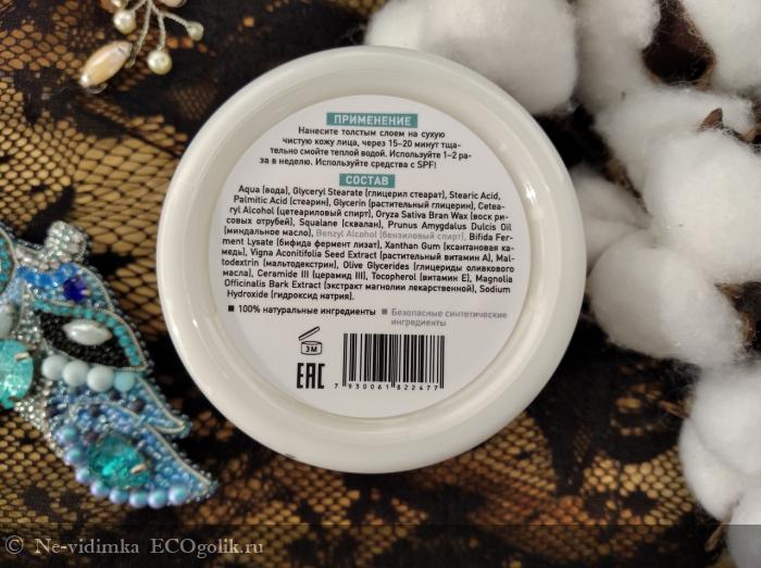 Состав: Вода, глицерил стеарат, стеарин, растительный глицерин, цетеариловый спирт, воск рисовых отрубей, сквалан, миндальное масло, бензиловый спирт, бифида фермент лизат, ксантановая камедь, растительный витамин А, мальтодекстрин, глицериды оливкового масла, церамид III, витамин Е, экстракт магнолии лекарственной, гидроксид натрия.