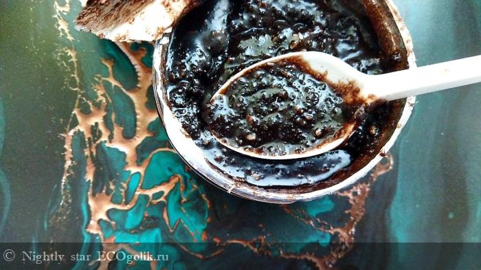 От первого вскрытия баночку защищает фольгированная мембрана, а под ней нас ожидает густая масса с умопомрачительным шоколадным запахом и нотками кокоса. Ох, не знала бы я, что это скраб, тотчас бы взяла десертную ложку и наелась бы вдоволь! Уж очень напомнило какую-нибудь кондитерскую пасту.