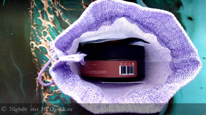 Начну с того, что производитель весьма трепетно подошел к вопросу упаковки и здесь это не просто привычная - пластиковая банка с винтовой крышкой и информационной наклейкой по периметру, но и безумно милый мешочек на затяжках нежного фиолетового оттенка, чем не готовый подарок для своих родных и близких? По - моему, идея просто замечательная. Не зря говорят : "встречают по обложке". Ну а провожать я этот скраб и вовсе теперь не хочу.