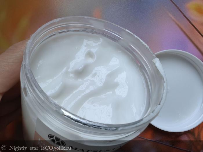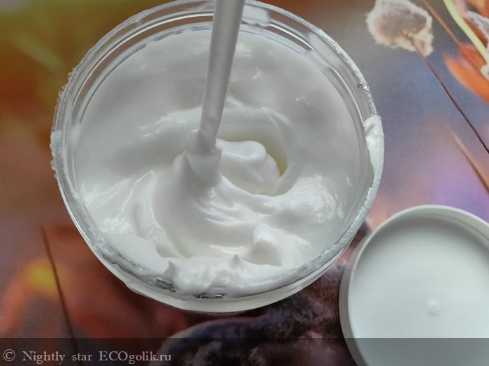 Маска в меру густая, белого цвета. Немного напоминает йогурт или крем для лица. С рук и из баночки, если перевернуть, не стекает. Но в ней есть легкая маслянистость, которая позволяет равномерно распределить продукт по волосам, обволакивая их и превращая в единое гладкое полотно. При хранении не расслаивается и остается в той же конситенции.