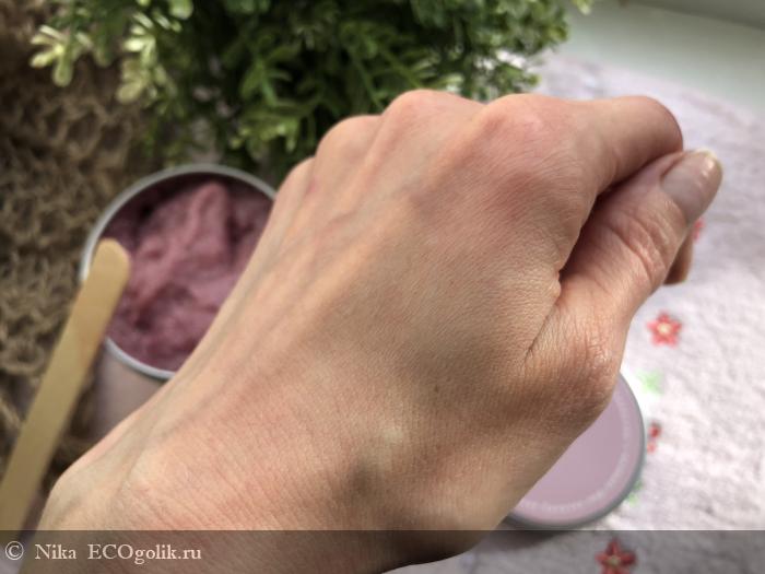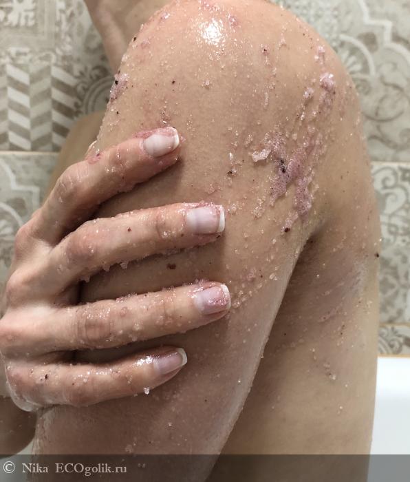 Кожа после применения слегка розовая, так как скраб отлично стимулирует кровообращение и тонизирует.
