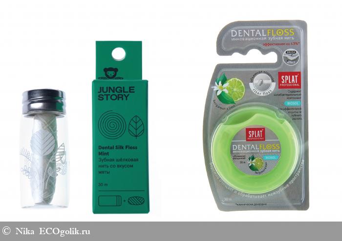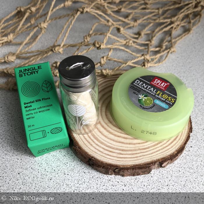 Для сравнения нить Jungle Story и нить Splat, которой я обычно пользовалась. Я много нитей перепробовала, но в результате остановилась на Splat. Хотя она мне тоже не совсем подходит - она мягкая, десны не повреждает (это для меня важно), но вот из-за того, что она объемная я не могу очистить все межзубные участки (зубы довольно плотно расположены). Тонкие синтетические нити, которые я пробовала, режут мне десна, поэтому от них я сразу отказалась.