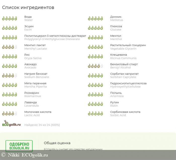 Вода деионизированная, экстракт донника, экстракт таволги, экстракт каштана конского, экстракт розмарина, экстракт полыни, глюкоза, полиглицерил-3-метилглюкозы дистеарат, ментол, ментиллактат, глицерин растительного происхождения, масло рисовое, масло клещевины, масло авокадо, бензиловый спирт, бензоат натрия, сорбитанкаприлат, эфирное масло мяты перечной, гидроксиэтилцеллюлоза, эфирное масло розмарина, эфирное масло полыни, эфирное масло лаванды, рутин, молочная кислота, сорбиновая кислота.