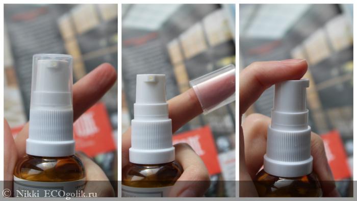 Снимаем прозрачный колпачок, флакон с дозатором. Дозатор плавно нажимает.