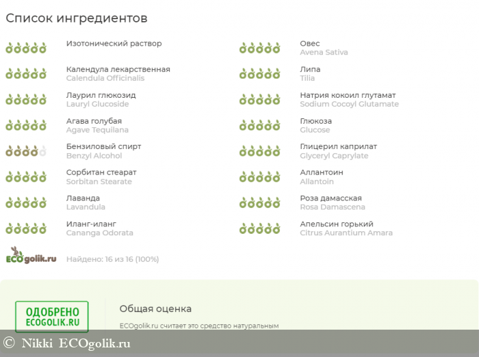 Изотонический физиологический раствор, овсяное молочко (отстоенное и отфильтрованное), экстракт цветов календулы, экстракт цветов липы, лаурилглюкозид натрия, кокоилглутамат натрия, инулин голубой агавы, глюкоза, бензиловый спирт, глицерил каприлат, стеарат сорбита, аллантоин, эфирное масло лаванды, эфирное масло болгарской розы, эфирное масло иланг-иланг, эфирое масло нероли.