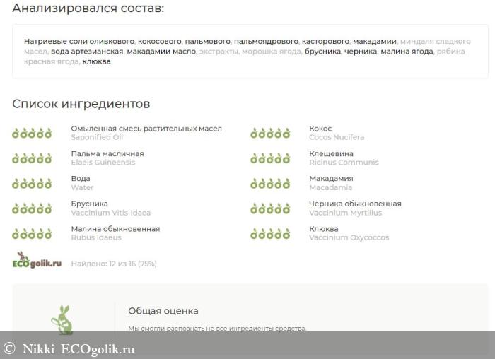 Натриевые соли оливкового, кокосового, пальмового, пальмоядрового, касторового, макадамии, миндаля сладкого масел, вода артезианская, макадамии масло, экстракты: морошка ягода, брусника (ягода, лист), черника (ягода, лист), малина ягода, рябина красная ягода, клюква.