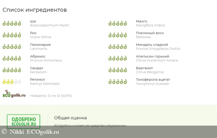 Масло Ши, масло манго, рисовое масло, пчелиный воск, инфузное масло ламинарии, масло миндальных косточек, абрикосовый воск, эфирное масло нероли (Citrus aurantium L.), эфирное масло сандала (Santalum album L.), эфирное масло бергамота (Citrus bergamiaL.),ретинола ацетат (витамин А), токоферола ацетат (витамин Е).