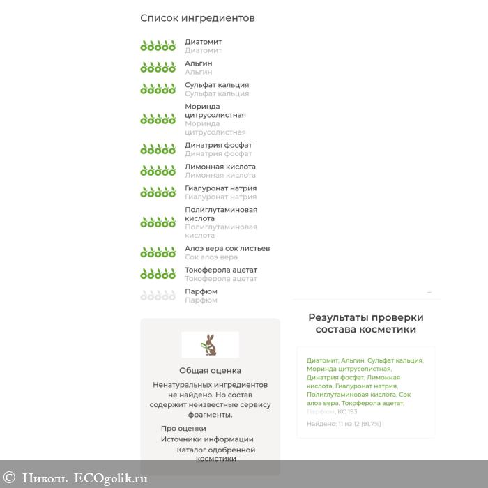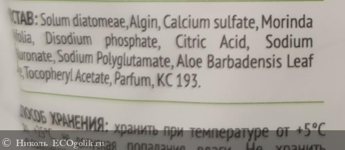 Состав классный. В нём: диатомит, Альгин, Сульфат кальция, Моринда цитрусолистная, Динатрия фосфат, Лимонная кислота, Гиалуронат натрия, Полиглутаминовая кислота, Сок алоэ вера, Токоферола ацетат, Парфюм, КС 193.
