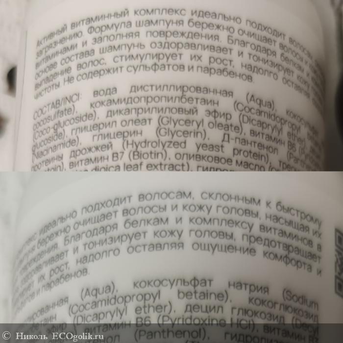 В составчике: вода дистиллированная (Aqua), кокосульфат натрия (Sodium cocosulfate), кокамидопропилбетаин (Cocamidopropyl betaine), кокоглюкозид (Coco-glucoside), дикаприлиловый эфир (Dicaprylyl ether), децил глюкозид (Decyl glucoside), глицерил олеат (Glyceryl oleate), витамин B6 (Pyridoxine HCl), витамин B3 (Niacinamide), глицерин (Glycerin), Д-пантенол (Panthenol), гидролизованные протеины дрожжей (Hydrolyzed yeast protein), треонин (Threonine), аллантоин (Allantoin), витамин B7 (Biotin), оливковое масло (Olive oil), бетаин (Betaine), экстракт крапивы (Urtica dioica leaf extract), гидролизованный пшеничный протеин (Hydrolyzed wheat protein), соль морская (Sea salt), эфирное масло грейпфрута (Citrus paradisi essential oil), лимонная кислота (Citric acid), гуар гидроксипропилтримониум хлорид (Guar hydroxypropyltrimonium chloride), экстракт каштана (Аesculus hippocastanum leaf extract), бензиловый спирт (Benzyl alcohol), эфирное масло иланг-иланг (Ylang-ylang essential oil), эфирное масло можжевельника (Juniperus communis essential oil), витамин Е (Tocopherol), сорбат калия (Potassium sorbate), дегидроуксусная кислота (Dehydroacetic acid).