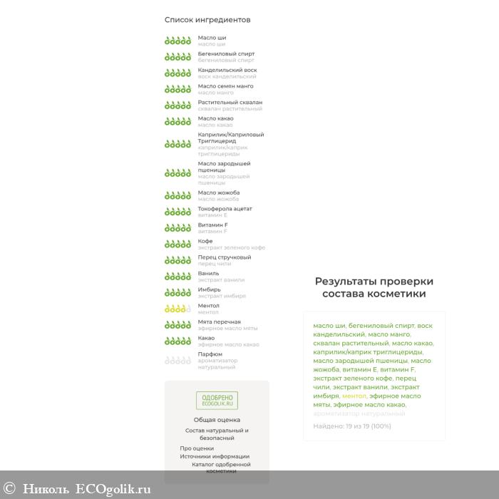 В составе: масло ши, бегениловый спирт, воск канделильский, масло манго, сквалан растительный, масло какао, каприлик/каприк триглицериды, масло зародышей пшеницы, масло жожоба, витамин Е, витамин F, экстракт зеленого кофе, экстракт перца чили, экстракт ванили, экстракт имбиря, ментол, эфирное масло мяты, эфирное масло какао, ароматизатор натуральный.