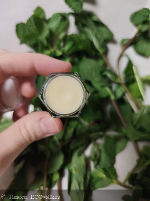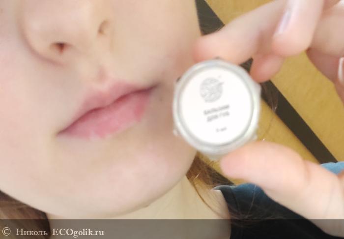 Бальзам светло-бежевого цвета. У него твёрдая восковая текстура. При наборе его пальцем, ощущается маслянистость. В составе аж 5 масел (ши, манго, какао, зародышей пшеницы и жожоба) и 2 эфирных масла (мяты и какао). Я наношу сначала его на палец, потом пальчиком провожу по губам. Не совсем удобно, конечно, но главное, что эффект радует. Кисточек у меня нет, так как я не крашусь совсем. А кисти, которые у меня есть, они для того, чтобы писать картины, не подходят для нанесения уходовых продуктов.