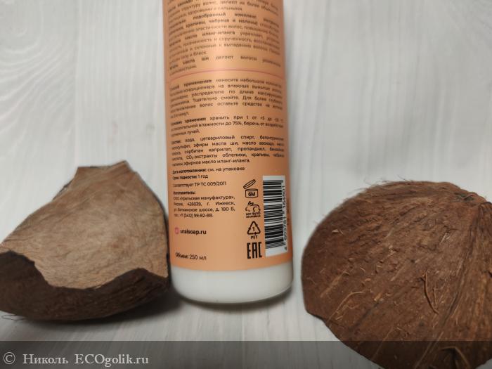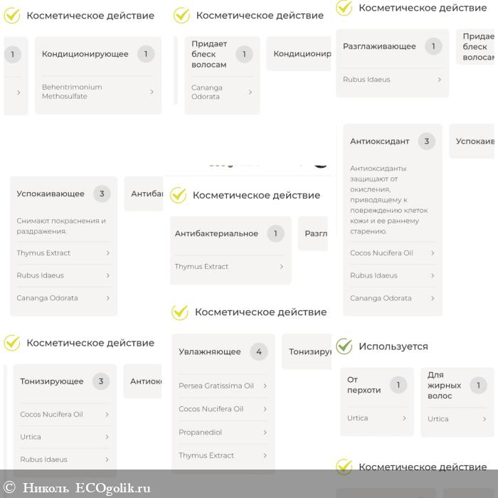 Следом указан классный состав. В нём нет силиконов. В составчике: вода, цетеариловый спирт, бегентримония метосульфат, эфиры масла ши, масло авокадо, масло кокоса, сорбитан каприлат, пропандиол, бензойная кислота, СО2-экстракты облепихи, крапивы, чабреца, малины; эфирное масло иланг-иланга