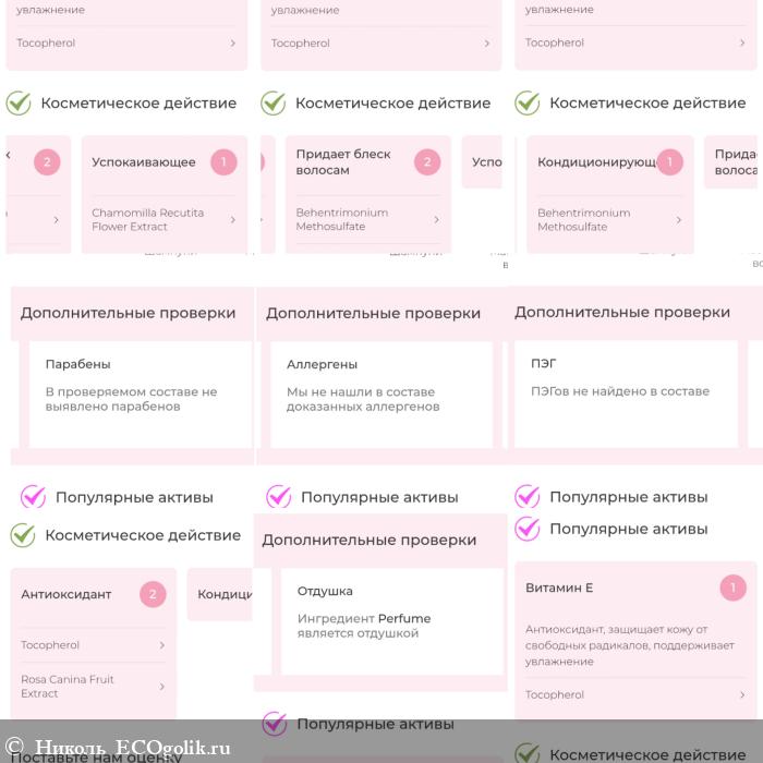 Вроде смотришь на состав и думаешь, что он лёгкий, ибо тут (бегентримония метосульфат, масло репейное, гидролизованные протеины пшеницы, бета-ситостерол, сквален и 4 экстракта (ромашки, шиповника, мяты, шалфея). Но по факту, этот бальзам-кондиционер оказывается очень классным средством в плане эффекта, да и аромат у него шикарный, по консистенции комфортный. Заслуженно ставлю оценку ему в 5 яблочек.