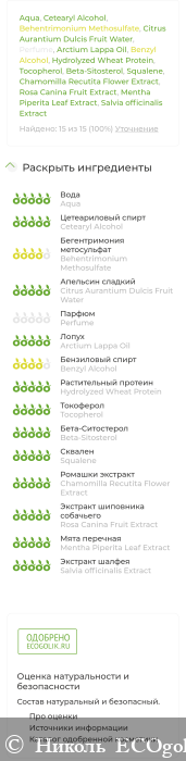 Здесь: Aqua (Вода), Cetearyl Alcohol (Цетеариловый спирт), Behentrimonium Methosulfate (ПАВ кондиционирующий), Citrus Aurantium Dulcis Fruit Water (Гидролат апельсина), Perfume (Парфюмерная композиция), Arctium Lappa Oil (Масло репейное), Benzyl Alcohol (Бензиловый спирт), Hydrolyzed Wheat Protein (Протеины пшеницы), Tocopherol, Beta-Sitosterol, Squalene (Антиоксидантный комплекс), Chamomilla Recutita Flower Extract (Экстракт ромашки), Rosa Canina Fruit Extract (Экстракт шиповника), Mentha Piperita Leaf Extract (Экстракт мяты), Salvia officinalis Extract (Экстракт шалфея)