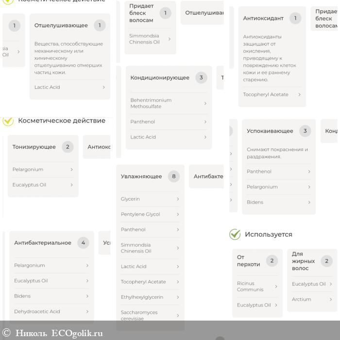 - Eucalyptus globulus essential oil (эфирное масло эвкалипта) регенерирует, тонизирует, заживляет, обладает бактеридным, антибактериальным действиями, придаёт аромат. Помогает избавиться от выпадения, устранить перхоть и излишнюю жирность кожи головы.