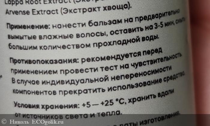Сначала кратко написано, что делает этот бальзам. После напечатан его отличный состав. В нём нет силиконов, минерального масла, продуктов животного происхождения, искуственных красителей и консервантов.