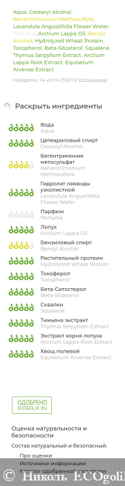 В составчике: Aqua (Вода), Cetearyl Alcohol (Цетеариловый спирт), Behentrimonium Methosulfate (ПАВ кондиционирующий), Lavandula Angustifolia Flower Water (Гидролат лаванды), Perfume (Парфюмерная композиция), Arctium Lappa Oil (Масло репейное), Benzyl Alcohol (Бензиловый спирт), Hydrolyzed Wheat Protein (Протеины пшеницы), Tocopherol, Beta-Sitosterol, Squalene (Антиоксидантный комплекс), Thymus Serpyllum Extract (Экстракт чабреца), Arctium Lappa Root Extract (Экстракт лопуха), Equisetum Arvense Extract (Экстракт хвоща)