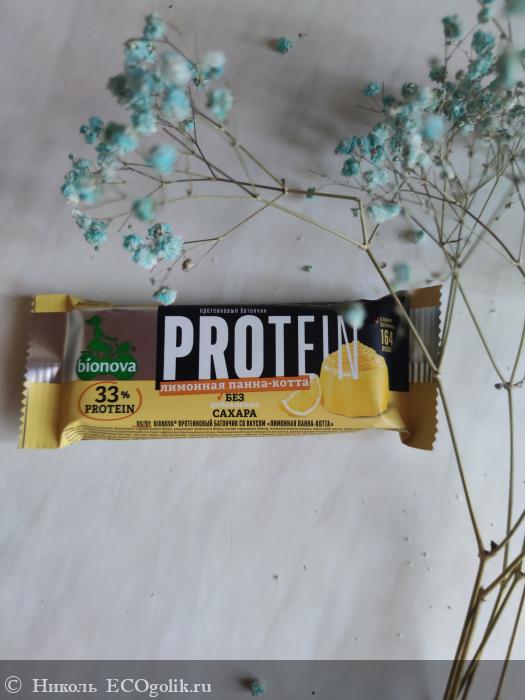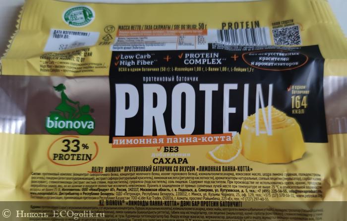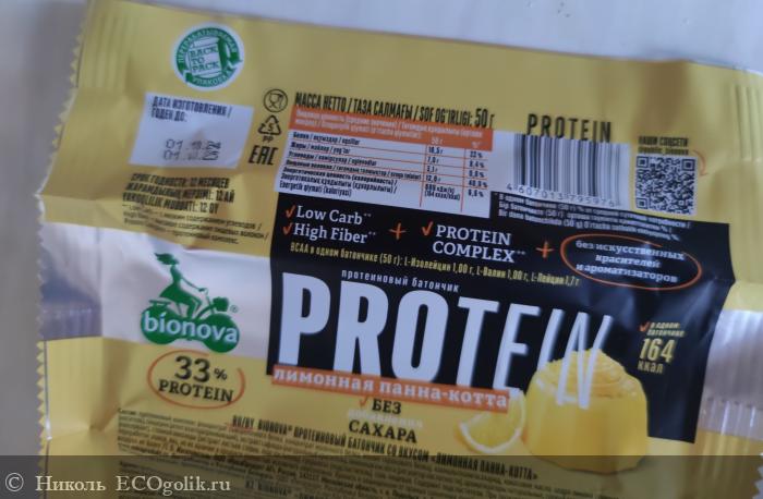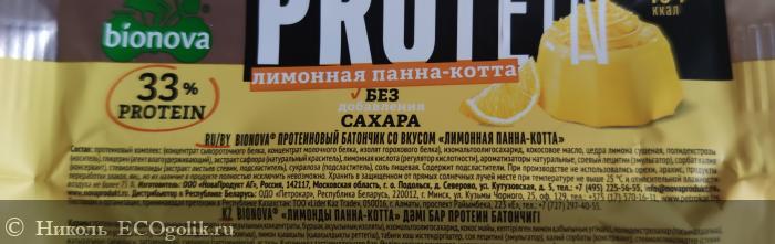 Упаковка этого батончика выполнена в жёлто-серебристом дизайне. На этикетке есть изображения дольки лимона и самого десерта - лимонная панна-котта. В этой вкусности есть аминокислоты и 33% протеина. По этой причине, он неплохо насыщает, даря чувство сытости на долгое время.