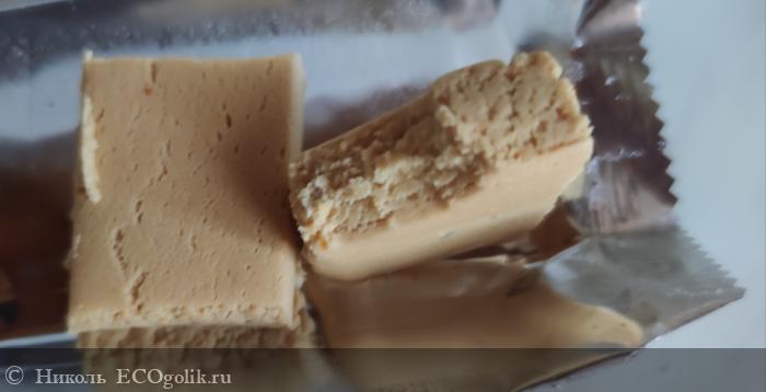 Сам батончик песочного цвета, плотный по массе, но мягкий.